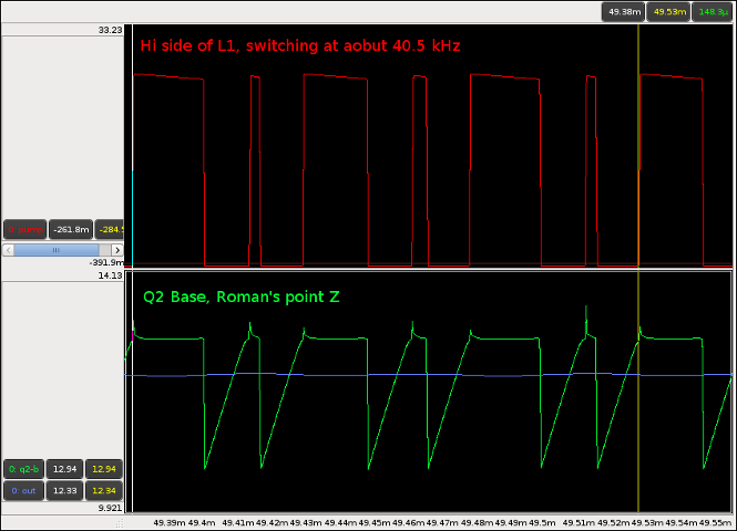 Clif, your circuit seems to alternate long and short cycles somehow, the trace does not look like Roman's.Yes Robert, it's called PWM and for the load it has on it which is somewhat different than Roman's example, this is the pattern it uses to regulate the voltage. It's caused by the fixed off time and that it falls a little bit behind on the short cycle but makes up for it on the long one. If I turned up the current draw I think they would even out.
